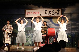 その後、国際通りで班別自主研修。ショッピングにスイーツにと充実した活動。今日の最後は、沖縄民謡のライブを聴きながら夕食に舌鼓。ステージに「飛び入り」もあり、会場は大盛り上がり。
